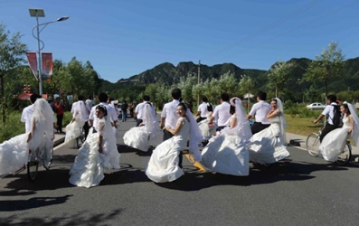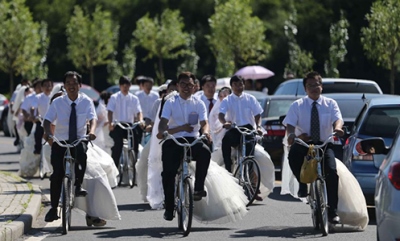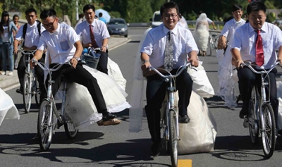 ارتدى 60 زوج ثياب زفافهما للمشاركة في حفل زفاف جماعي أقيم على دراجات هوائية في بكين.