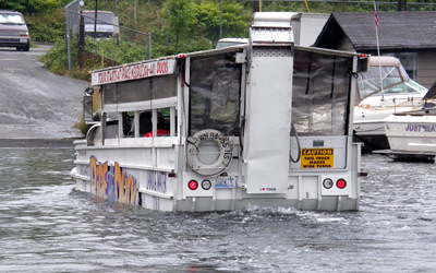 بعد ذلك قام الكابتن لو سكانون بجولة على بحيرة لاك أونيون، وهي بحيرة جليدية داخل المدينة تقع ما بين خليج بوجيـه ساوند وبحيـرة واشـنطن. وهناك تعلق السياح بأمل أن تكون المركبة البطة صالحة للإبحار، قبل أن ينزل منحدر القارب في البحيرة، وقام لو سكانون باستبدال خوذة الدراجة بنوع من قبعة البحارة، وبالفعل تمكنت مركبته البرمائية من الطفو فوق الماء، وفي تلك الأثناء كانت قطرات الأمطار تتساقط على سطح الماء لتشكل دوائر جميلة للغاية. وكان هناك رجل مسن يلوح بقبعته من أحد القوارب المنزلية. ويوجد في مدينة سياتل نحو 500 من المنازل العائمة الأنيقة، وشهد أحد هذه المنازل، ذات الشكل الجملوني والمطلية باللون الرمادي مع شرفة وسلاسل بها زهور، تصوير أحداث فيلم الساهر في سياتل، بطولة توم هانكس وميغ رايان. ويتردد أنه تم بيع هذا المنزل أخيراً نظير 5ر2 مليون دولار.