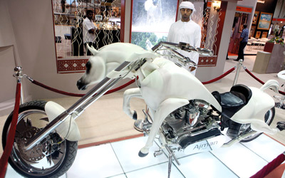لفت جناح مربط عجمان أنظار زوار المعرض الدولي للصيد والفروسية 2013، بدراجة نارية يبلغ سعرها نحو مليون درهم، وهي على شكل الحصان «سكيب» الفائز ببطولات عدة، الذي تعود ملكيته إلى سمو الشيخ عمار بن حميد النعيمي، ولي عهد عجمان، بحسب ما أشار مدير مربط عجمان، خالد العميري، الذي بيّن أن الدراجة من نوع «شوبر»، وتم تجهيزها بأحدث التقنيات الحديثة في عالم الدراجات النارية، ونفذت بأيدي أمهر المتخصصين في صناعة الدراجات الهوائية بأميركا. وقال إن الحصان «سكيب» من أبرز الخيول التي يمتلكها سمو الشيخ عمار بن حميد النعيمي، ويمتلك سجل إنجازات عالمية في بطولات عدة.