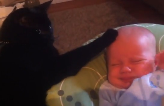 تم تداول مقطع فيديو لقط منزلي يقوم بتهدئة طفل رضيع يبكي حتى ينام.