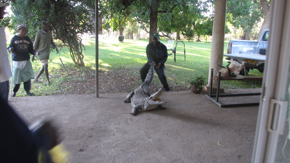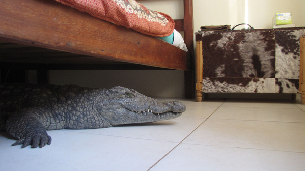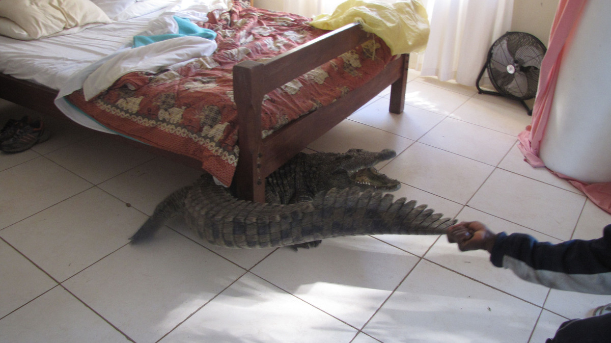 فوجئ رجل بمدينة هيوماني لودج بزيمبابوي عند استيقاظه من النوم بوجود تمساح ضخم، يزن 150 كيلوغراماً، وبطول 2.4 متر، مسترخياً أسفل سريره.