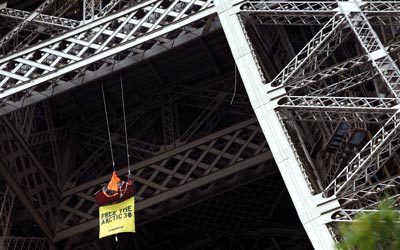 علق نشط من جماعة السلام الأخضر (غرينبيس) نفسه من برج إيفل، أمس، للمطالبة بالإفراج عن 30 شخصاً أمضوا أكثر من شهر في سجن روسي، بعد أن احتجوا على التنقيب عن النفط في منطقة القطب الشمالي. وبعد أن تدلى من الطابق الثاني من البرج فرد لافتة كبيرة صفراء اللون كتب عليها «الحرية لـ30» في إشارة إلى المحتجين الـ30. وأنزل النشط رجال الإطفاء بعد نحو ساعتين دون وقوع أي حادث.