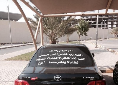 وضع سعودي على زجاج سيارته ملصقاً يدعو فيه المسلمين للدعاء لزوجته بالشفاء، وكتب على الملصق الذي وضعه على الزجاجة الخلفية للسيارة” ادعوا لزوجتي بالشفاء”، ووضع تحته دعاء لها.