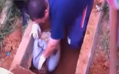 وكشف شريط فيديو رجال الإنقاذ وهم يزيلون التراب عن جسد الرجل، كما أظهر المقطع أن نصف الرجل كان مازال مدفوناً تحت التراب، قبل أن يسحبوه خارج القبر، في منطقة قريبة من "ساو باولو".