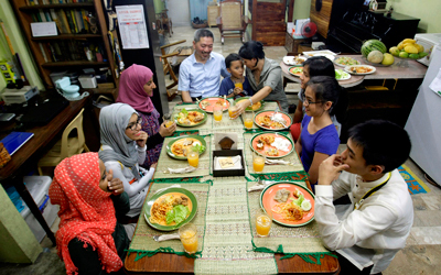 فاطمة عبدالرحمن وتسنيم النقبي ومريم الكويتي (يسار) يتناولن الطعام عند إحدى الأسر الفلبينية. من المصدر