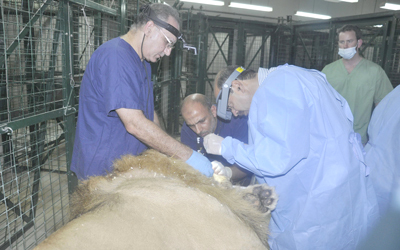 وأكد الطبيب البيطري، الذي فضل عدم ذكر اسمه، أن «الأسد حظي بزيارة غير متوقعة من أحد الأطباء المتخصصين في علاج العيون، وشُكل فريق عمل يجمع بين الأطباء البيطريين في الحديقة والطبيب الزائر، وأجريت الجراحة في الوقت المناسب»، لافتاً إلى أن الجراحة استغرقت نحو 45 دقيقة، وبذل الفريق الطبي جهوداً كبيرة لتهدئة الأسد الضخم (175 كيلوغراماً) بعد وضعه على طاولة العمليات الجراحية.