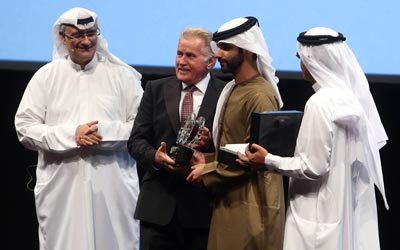 منصور بن محمد بن راشد يكرّم النجم العالمي مارتن شين في افتتاح مهرجان دبي السينمائي أمس. تصوير: باتريك كاستيلو
