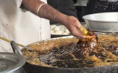 يستمتع طباخ هندي بوضع يده في الزيت المغلي أثناء اعداده لوجبات سمك في أحد المطاعم بمدينة دلهي.