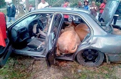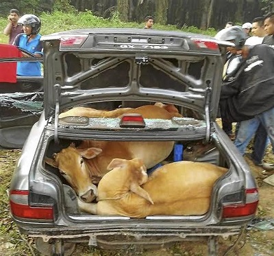 قام ثلاثة لصوص، بسرقة 4 أبقار من إحدى المزارع في "سونغاي بوكيت" بماليزيا، مما أدى إلى افتضاح أمرهم حين انهارت السيارة تحت الحمل الثقيل.