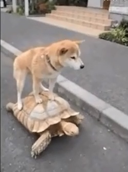 تداولت مواقع تواصل اجتماعي مقطع فيديو لكلب "كسول"، قرر أن يأخذ جولة على ظهر سلحفاة.