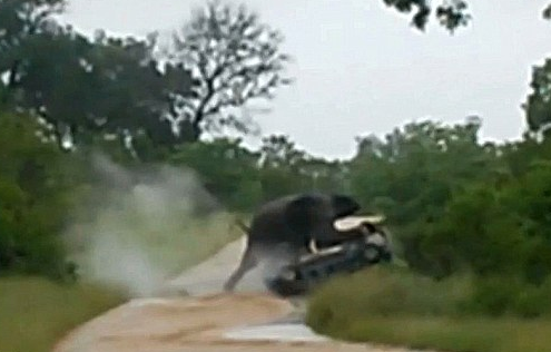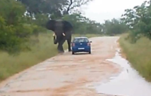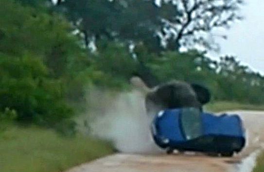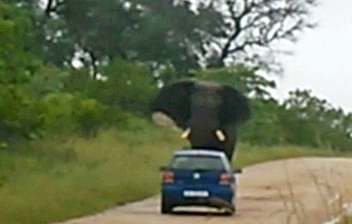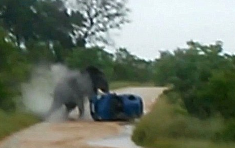 هاجم فيل هائج سيارة سياح صغيرة في حديقة حيوانات ومحمية وطنية في جنوب أفريقيا، بصورة مفاجئة ومخيفة، حيث استدار بدون أي سبب يذكر وقام بقلب السيارة ودحرجتها عدة مرات قبل أن يتركها ويذهب.