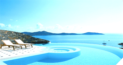 منتجع فيلات وأجنحة خليج إيلوندا، اليونان، بركة سباحة خاصة مندمجة بشكل رائع مع محيطها.