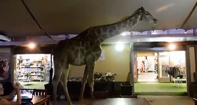 انطلق رواد حديقة الحيوان المفتوحة "ليون بارك" في جوهانسبرج، في نوبة ضحك هيستيرى بعد أن دخلت عليهم زرافة في مطعم الحديقة وهي تتجول غير مبالية لوجودهم.
