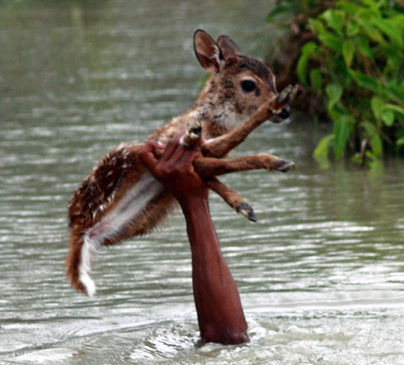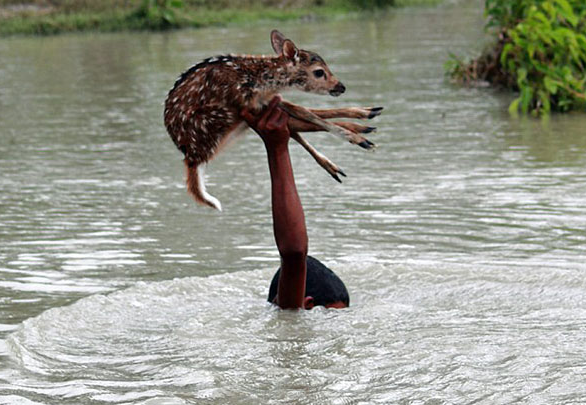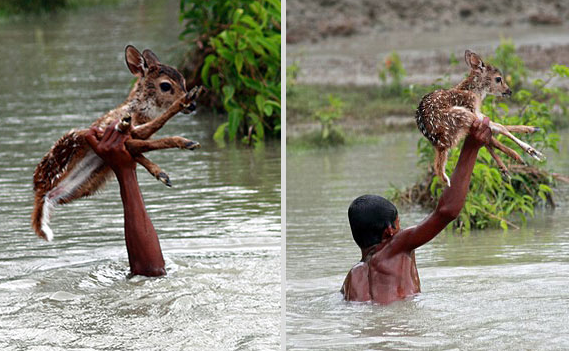 التقطت عدسة المصور حسب الوهاب (بنغلاديش) من تصوير موقف بطولي لطفل يقدر عمره بالثالثة عشرة حينما قفز في فيضان كان يجتاح بلدته لينقذ صغير غزال علق في المياه التي كادت تجرفه وتودي بحياته، إلا أن تدخل الطفل بلال أنقذه من الموت، حيث قام بلال بإمساك الغزال الصغير من سيقانه الأربع، ورفعه فوق رأسه عابرا به المياه، منقذا بذلك حياته.