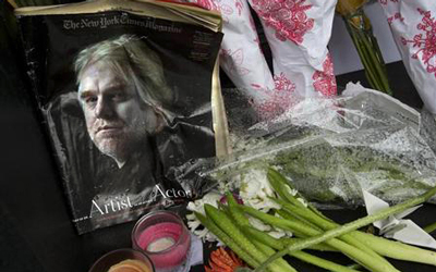 صورة لفيليب هوفمان على غلاف مجلة إلى جانب ورود أمام شقته في نيويورك. رويترز
