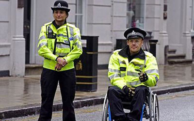 شرطي بريطاني على كرسي متحرك. أرشيفية