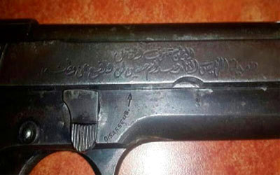 المسدس وتظهر عليه كلمات الإهداء من صدام٫ من المصدر