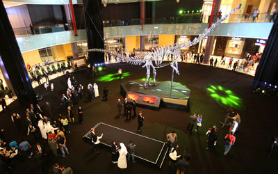 تمكنت «إعمار»، أول من أمس، من تحويل زيارة «دبي مول» إلى تجربة فريدة، بعد أن عرضت هيكلا عظميا لديناصور من فصيلة «ديبلودوكوس لونجوس»، والذي يعد من أكبر المخلوقات التي عاشت على سطح الارض في العصر الجوراسي المتأخر، منذ نحو 155 مليون سنة. أضيء الهيكل الخاص بالديناصور بالليزر بالأخضر والأحمر، عند إزاحة الستارة السوداء، التي أحاطته والتي دفعت الناس للتجمهر على الطوابق المختلفة للمركز، لمعرفة ماذا تخفي خلفها، بعد أن أحيط الكشف عن الحدث بالكثير من الغموض.