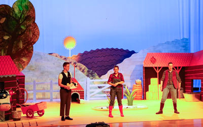 وتفاعل جمهور الأطفال مع مجريات المسرحية المستوحاة من قصة المؤلفة جوليا دونالدسون حول لصّين ماكرين وخنفساء صغيرة في فناء مزرعة بعيدة مليئة بالمرح.