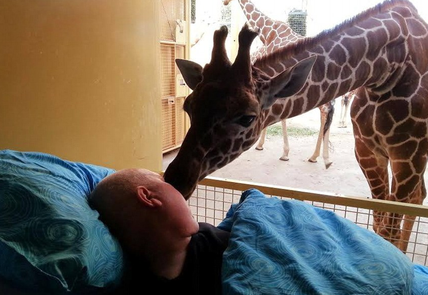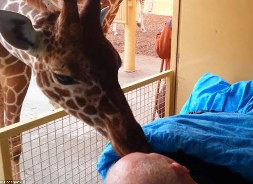 في لقطة مؤثرة جدا قامت زرافة بإعطاء "قبلة" وداع للرجل الذي كان يعتني بقفصها في حديقة حيوان عامة وفي هولاند، بعد أن شخص راعيها "ماريو" بمرض السرطان وحدد له أسابيع قليلة ليعيشها.