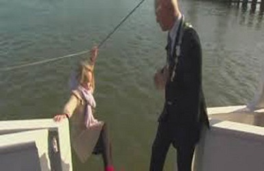 وتظهر المراسلة الشقراء في الشريط المصور، وهي تسير على قارب، متجهة نحو المحافظ، الذي ينتظرها بغية الإجابة على أسئلتها.