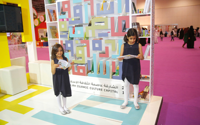 طفلتان تطالعان قصتين مزينتين برسوم جميلة، وكلمات بسيطة، تأخذهما إلى عوالم ملونة، وفي الخلفية شعار الشارقة عاصمة للثقافة الإسلامية كمكتبة تفيض بنور المعرفة، خلال مهرجان الشارقة القرائي للطفل، الذي يستضيف فعالياته مركز إكسبو للمعارض والمؤتمرات، حتى 25 الجاري.