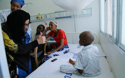جواهر القاسمي خلال زيارتها إلى أحد مستشفيات علاج السرطان في تنزانيا بحضور ماما سلمى كيكويتي. من المصدر