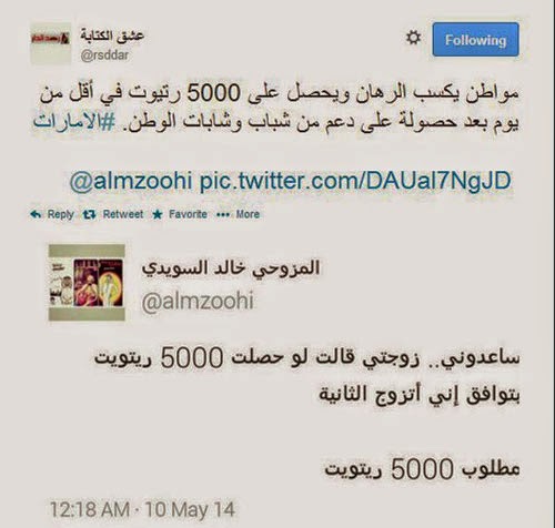 نشر الكاتب خالد السويدي الملقب في موقع التواصل الإجتماعي" تويتر"، بالمزوحي خالد السويدي، أخيراً، تغريدة عن رهان افتراضي مع زوجته الأولى، لتوافق على زواجه بأخرى، حيث اشترطت عليه الحصول على 5000 إعادة تغريدة.
