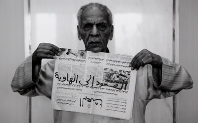 سيرة فنية ولد الفنان السوري جابر العظمة في دمشق عام 1973. قدم معرضه الفردي الأول عام 2009 في «غاليري أتاسي» بسورية، ثم قدم في عام 2011، معرضه الفردي الثاني في «غرين آرت غاليري» في دبي، ثم معرضه الأخير «جروح» عام 2012 في دبي ايضاً. شارك في مجموعة من المعارض الجماعية، ومنها في باريس وبرلين، وإيطاليا. وهو يعيش ويعمل حالياً في الدوحة. هموم المعرض الذي قدمه جابر العظمة هو المعرض الثاني الذي يعبر فيه عن الأزمة السورية، اذ سبق وقدم معرضاً تحت عنوان «جروح» عام 2012. وكانت قد غلبت على معرضه السابق هيئة الصراع ولون الدم، بينما يبدو اليوم أكثر توجهاً لهموم الناس من التوجه لعكس حالة الصراع الدائر في سورية، إذ ركز على الهموم الشخصية والإنسانية لدى أبناء بلده. شخصيات حمل المعرض مجموعة من الشخصيات البارزة في الساحة السورية من مجموعة من المجالات الثقافية، فمن بين الممثلين كانت هناك صور لكل من يارا صبري، وفارس الحلو، ولويز عبدالكريم، وحلا عمران، وزينة الحلاق. بينما في مجال الفن كانت هناك صورة للموسيقي سميح شقير، في حين كانت مشاركة للتشكيلي يوسف عبدلكي، والخطاط والفنان منير الشعراني. وكانت هناك مجموعة من الناشطين والإعلاميين والمصورين ومصممي الغرافيك، في حين كانت الصورة الوحيدة التي كانت لغير سوري صورة الشاعر الراحل أحمد فؤاد نجم الذي حمل الجريدة وكتب عليها «الصعود الى الهاوية»، وكان العظمة قد التقى نجم مصادفة وتمت الصورة بالمصادفة ومن دون ترتيب مسبق. |