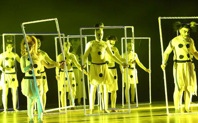 مشهد من العرض المسرحي الإماراتي «دومينو»، الذي افتتحت به فعاليات مهرجان المسرح الخليجي للفرق الأهلية، في الشارقة أمس.