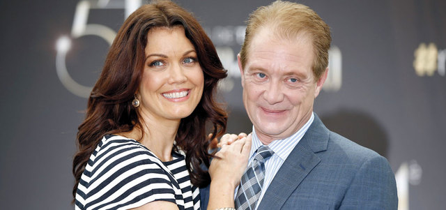 جيف بيري والنجمة وبيلامي في صورة خلال مشاركتهما في الترويج للبرنامج التلفزيوني «فضيحة» في مهرجان «مونتي كارلو» للتلفزيون.