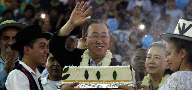 تلقى الأمين العام للأمم المتحدة بان كي مون هدية غير تقليدية في عيد ميلاده الـ70، عندما قدم له رئيس بوليفيا، إيفو موراليس، كعكة من أوراق نبات الكوكا، الذي يستخدم في صناعة الكوكايين. وتوجه بان إلى مدينة سانتا كروز في بوليفيا، لحضور اجتماع لمجموعة الـ77، لمناقشة إجراءات الحد من الفقر. وتستخدم أوراق الكوكا في صناعة الكوكايين، لكن موراليس وهو مزارع سابق للكوكا يدافع منذ وقت طويل عن تقنين استخدامها، بصفتها «إحدى شعائر الأجداد» لصنع الشاي والحلويات والأدوية. وكان موراليس قد أخرج أوراق كوكا من كيس بلاستيكي صغير، أثناء اجتماع لمكافحة المخدرات تابع للأمم المتحدة عام 2012 ومضغ بعضها. وبدا بان متأثراً لدى قبول الهدية، أول من أمس، لكنه لم يأكل منها، ولم يقر موقف موراليس المؤيد لاستخدام الكوكا.