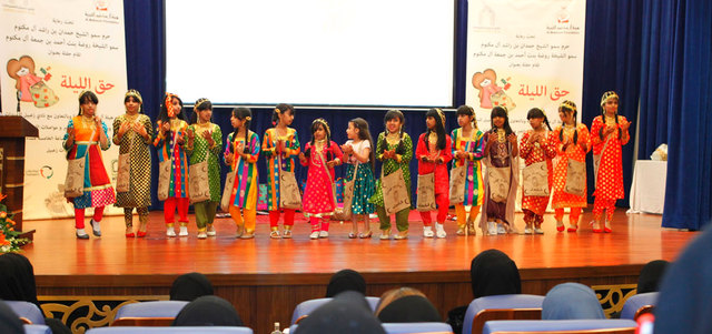 لوحة من احتفال هيئة آل مكتوم الخيرية، بمناسبة «حق الليلة»، الذي شهد تكريم 40 طفلاً يتيماً و48 طالباً، واشتمل على فقرة تراثية عن ليلة النصف من شعبان، وعرض أزياء تراثي، وبرنامج ترفيهي لإدخال الفرحة إلى قلوب الأطفال والأيتام.
