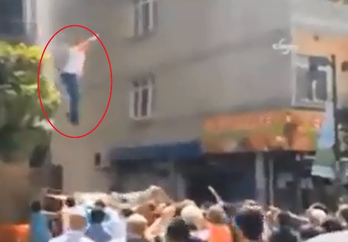 ويوضح الفيديو احتشاد الأهالي بالشارع أسفل المبني، للامساك بالمرأة.