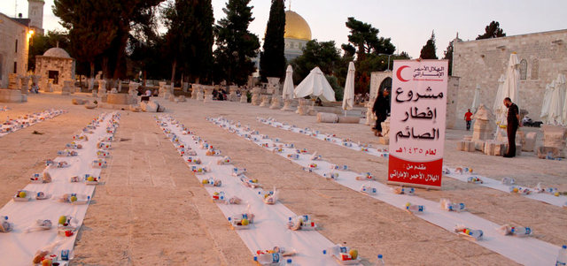 نفّذت هيئة الهلال الأحمر إفطارات رمضانية يومية في ساحات المسجد الأقصى المبارك، بمعدل 500 وجبة إفطار يومياً، للصائمين والمعتكفين في الأقصى. ونظّم مكتب الهيئة في الأراضي الفلسطينية هذه الإفطارات بالتعاون مع مديرية الأوقاف بالقدس، حيث أقبل الصائمون، من المصلين ومن حرّاس المسجد الأقصى، على هذه الإفطارات، وتمّ توزيع المياه والتمور عليهم أيضاً. وأشرف مكتب الهلال الأحمر على توزيع 400 وجبة إفطار ساخنة يومياً، على العائلات المحتاجة من سكان البلدة القديمة في القدس وضواحيها، الذين يعانون ضائقة اقتصادية كبيرة.