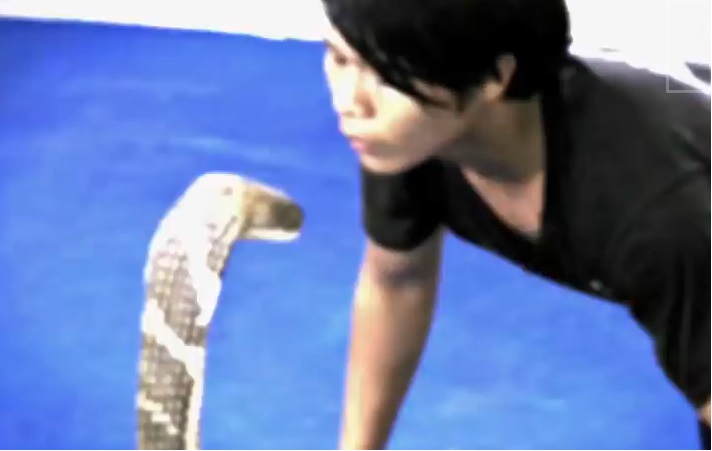 تمكن تايلندي، خلال عرض حي أقيم أمام حشد من الجماهير، من تقبيل أفعى الكوبرا، التي تنتمي إلى صنف الثعابين السامة الخطرة والنشيطة جداً.