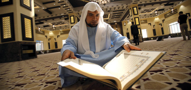 إمام مسجد خليفة التاجر يقرأ القرآن في المسجد الذي تم افتتاحه في 20 رمضان بمنطقة ديرة بدبي.
