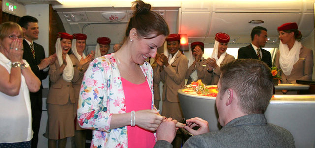 فبعد إقلاع طائرة إيرباص A380 من دبي بقليل، طلب ستيوارت من أفراد طاقم الخدمات الجوية مساعدته على التقدم بطلب الزواج إلى صديقته التي كانت ترافقه على الرحلة بطريقة مبتكرة. وصادف أن كان على الرحلة فرقة موسيقية لكلية بارادين في نيوزيلندا، فأعد أفراد الطاقم منطقة الصالون الجوي في الطائرة. وعلى أنغام الفرقة وأداء إحدى المضيفات الموهوبات أغنية لويس أرمسترونغ الشهيرة «يا له من عالم رائع»، طلب ستيوارت يد فكتوريا، وسط صيحات الفرح من الحضور وتصفيقهم.