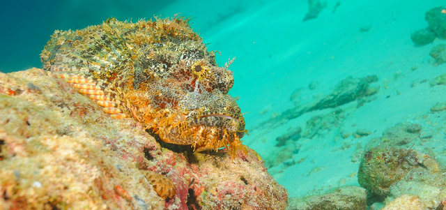 يصعب جداً أن تميز السمكة الصخرية، لأنها تستطيع أن تغير لونها على حسب البيئة المحيطة بها، فشكلها فعلاً مثل الصخرة؛ وتوجد دائماً على الصخور المرجانية، حيث توجد أسماك الزينة الصغيرة التي تتغذى عليها.