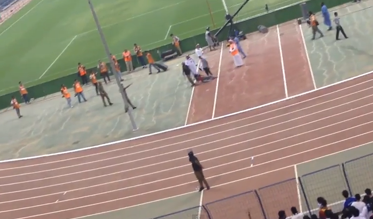 قام رجل أمن بضرب مشجع شاب بالهراوة وركله مرارا بعد أن اقتحم الملعب أثناء مباراة بين فريقي الهلال السعودي والسد القطري في ذهاب الدور ربع النهائي من بطولة دوري أبطال آسيا.