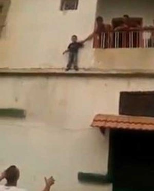 تداولت مواقع تواصل اجتماعي مقطع فيديو يظهر طفل يبدو في الخامسة من عمره، يقف على حافة شرفة منزل، بينما يقف ذويه في الشرفة، لتحفيزه على القفز!.