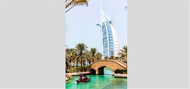 سيّاح يتجولون في قارب صغير في مدينة جميرا بالقرب من برج العرب في دبي.