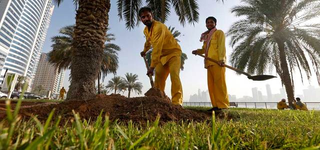 تسعى الإمارات دائماً، كونها من أكثر دول العالم اهتماماً بالبيئة ونظافة المدن، إلى تحقيق مكانة بارزة في جميع التقييمات العالمية في هذا الأمر. وفي هذه الصورة عاملان يهتمان بأشجار النخيل، التي تزدان بها بحيرة خالد.