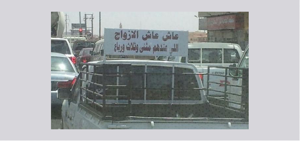 تداولت مواقع تواصل اجتماعي لقطة مصورة تظهر سيارة "بيك آب" من طراز تويوتا، مثبت فوق سقفها لافتة مكتوب عليها "عاش عاش الأزواج اللي عندهم مثنى وثلاث ورباع".