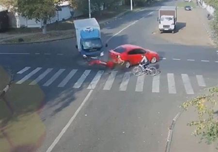 انتشر مقطع فيديو على موقع التواصل الاجتماعي "يوتيوب"، يظهر فيه سائق دراجة على مفترق طرق، وهو يحاول العبور إلى الطرف الآخر من الشارع بحذر شديد.