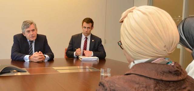 الشيخة جواهر القاسمي خلال لقائها غوردون براون. من المصدر