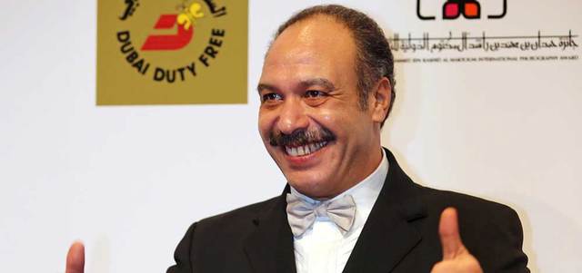 خالد صالح والضنحاني وعدد من الفنانين المصريين خلال آخر زيارة له للإمارات التي فوجئ فيها بالاحتفال بعيد ميلاده الأخير من إدارة المهرجان. أرشيفية