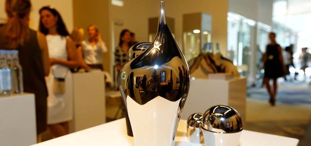 وعرض المصمم السويدي راغنر فريبيرغ مجموعة من التصاميم الفريدة التي تجمع بين الذهب والألمنيوم والألماس، الى جانب الجلد الطبيعي. وقال عن مجموعته، «أقدم في المعرض علبة خاصة ببطاقات العمل، وحقيبة يد نسائية، وكلاهما مصنوعان من الذهب والجلد والألمنيوم، ويدخلهما الجلد الطبيعي». ولفت إلى ان التصميم الذي أتى شبيهاً ببرج العرب، كان مجرد تصميم صغير لرفوف يجب ان تصمم بحجم كبير، كي توضع في المنزل، وتستخدم لعرض بعض التحف. والى جانب التصاميم قدم المصمم السويدي الخاتم الذي تتوسطه حبة من الألماس، وقد استغرق ما يقارب الشهرين كي ينجز، حيث تم تلميعه وتنعيمه يدوياً. اما التصميم الأبرز فكان الكأس المصنوعة من الذهب، التي يدخلها الألماس في الوسط، الى جانب العلبة الخاصة بها، التي تجمع بين الذهب والزجاج وكذلك الكربون. ورأى ان هذه التصاميم المميزة تعرض للمرة الأولى في دبي، وهي مرتفعة الثمن، نظراً لكونها تتطلب الكثير من الوقت فبعضها يتطلب شهوراً عديدة ولا يمكن تصنيع مجموعة كبيرة من القطع، فالكأس لا يمكنني تقديم أكثر من اربع قطع منها، الى جانب المواد التي تصنع منها. ولفت الى انه لا يهتم الى الهدف من وراء شراء القطعة، سواء كان بهدف استخدامها او الاستمتاع بها كقطعة فنية، فما يعنيه ان يكون المرء محباً القطعة.