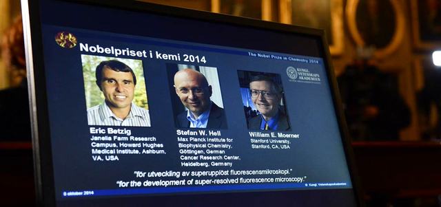أعلنت جائزة نوبل أن العالمين الأميركيين إريك بيتسيج ووليام مورنر، والعالم الألماني شتيفان هيل، فازوا بجائزة نوبل للكيمياء لعام 2014، لابتكارهم أسلوباً للفحص المجهري الفلورسنتي البالغ الدقة. وقالت الأكاديمية الملكية السويدية للعلوم في بيان: «أتاح هذا الإنجاز رفع مستوى الفحص المجهري إلى مستوى النانو». وتبلغ قيمة جائزة نوبل ثمانية ملايين كرونة سويدية (1.1 مليون دولار).
