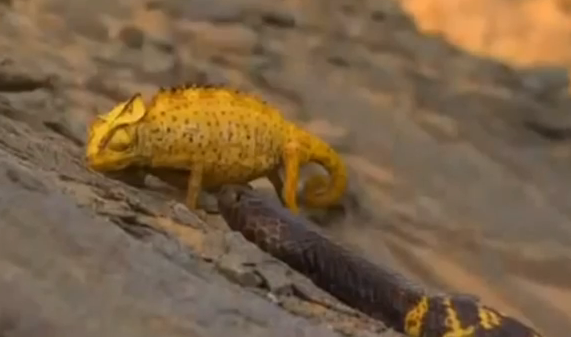 وتظهر في الفيديو الذي عرضته قناة "ناشيونال جيوجرافيك" الأفعى وهي تلاحق الحرباء، وعند بداية اللقاء تحاول الحرباء تضخيم جسمها بقدر الإمكان كحركة دفاعية منها لإخافة العدو، إلا أن الأفعى تهاجمها بضربة واحدة. وتنتظر حتى يسري مفعول السم لتبدأ في التهام وجبتها.